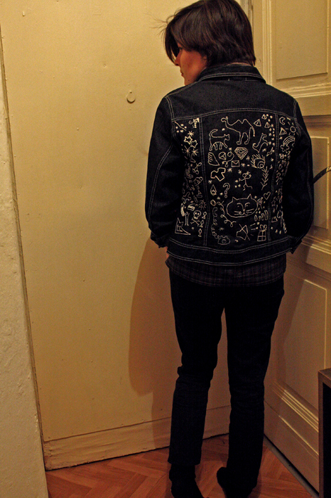 Yay! I'm in love with my DIY jean jacket! I feel so comfortable in it and it goes with almost everything in my closet (which is not so big... -.-). Here: DIY jean jacket, second-hand shirt, VERY old black jeans (I cut them shorter, I was, and still am, inspired by lovely Mrs Hepburn) and scarf which my mom gave me. I don't wear any shoes. I just got home and I took them off. It was a simple black sneakers though.